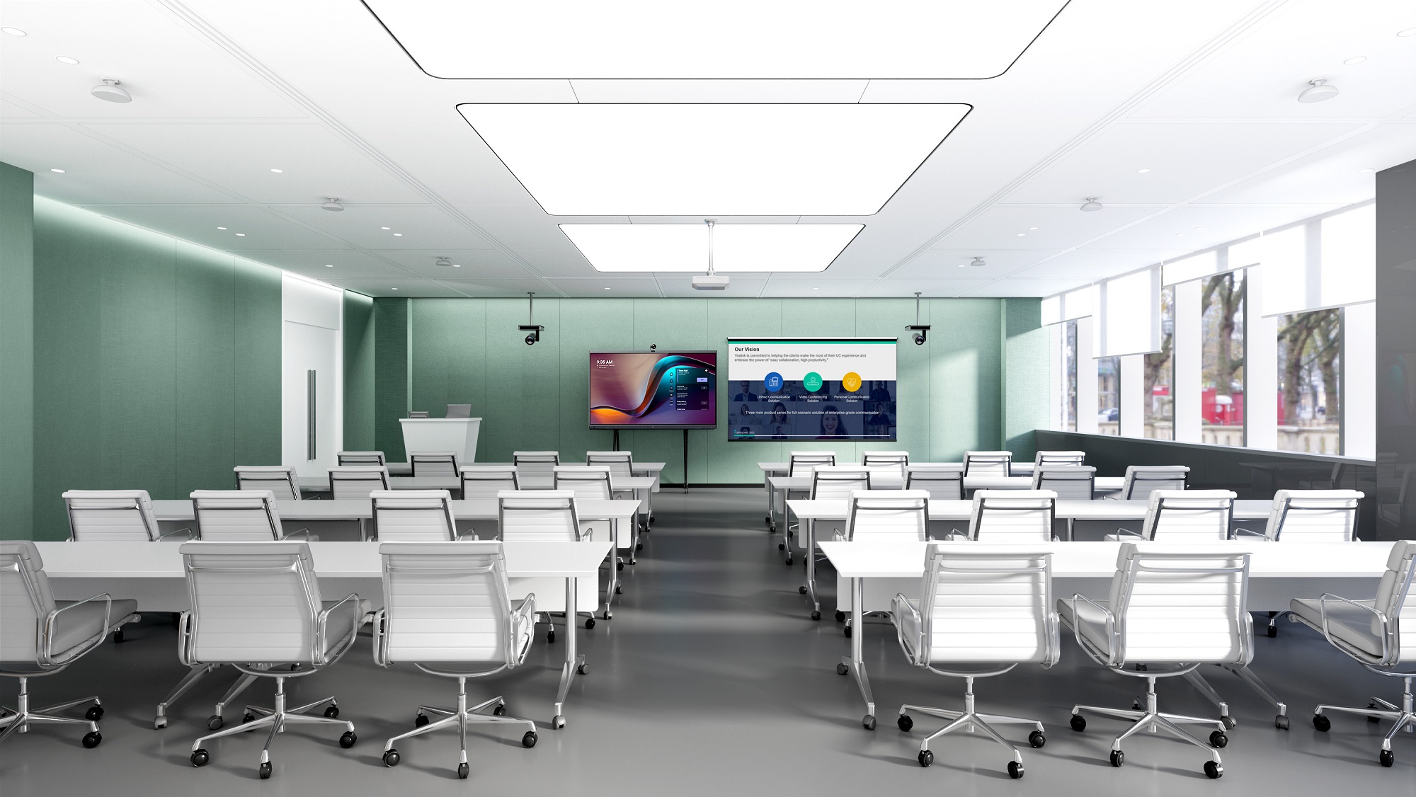 Терминал видео-конференц-связи "все-в-одном" для переговорных комнат среднего размера. Видеобар с встроенными кодеком, двумя видеокамерами, саундбаром и массивом из 8 микрофонов комплектуется монтажным кронштейном и пультом управления. Опционально поддерживается сенсорную панель управления, беспроводные микрофоны, адаптеры беспроводной и проводной передачи контента Yealink. Хорошо интегрируется в решениях с Yeallink Meeting Server и облачным сервисом Yealink Meeting Cloud, совместим с решениями других вендоров по протоколам SIP и H.323, поддерживает режим BYOD с помощью VCH51 для коммуникационных приложений пользователя.